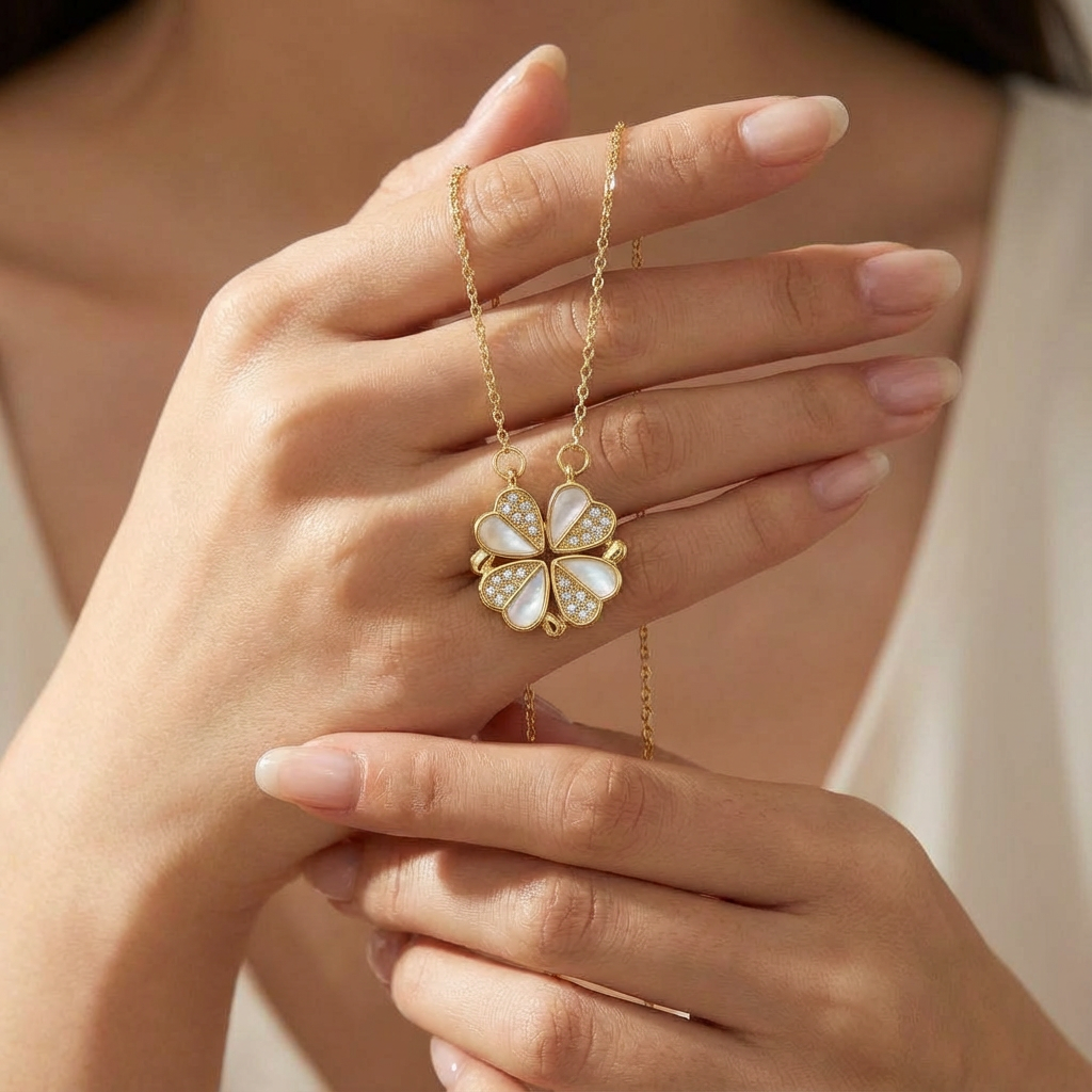 Questo gioiello unico e versatile può essere indossato come un quadrifoglio o come quattro cuori. Il pendente è impreziosito da scintillanti pietre di zirconia cubica, creando un effetto ipnotico e accattivante. È un regalo perfetto per una persona speciale nella tua vita, o semplicemente un'aggiunta fantastica alla tua collezione di gioielli.